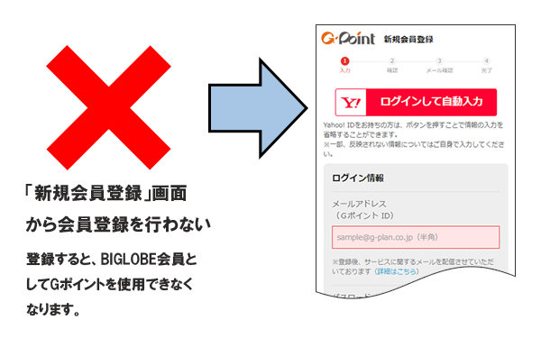 会員登録を以下のGポイント公式サイトにある「新規会員登録」から手続きを行うとBIGLOBE会員としてGポイントを利用できなくなりますのでご注意ください。