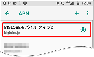 - APN(アクセスポイント)一覧上で、「BIGLOBEモバイルタイプD(A)」の右横が