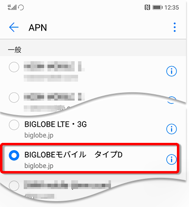 - APN(アクセスポイント)一覧上で、「BIGLOBEモバイル タイプD(A)」の左横が