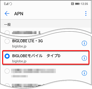 「BIGLOBE LTE・3G」の項目がある場合でも、「BIGLOBEモバイル タイプD(A)」を選択ください。