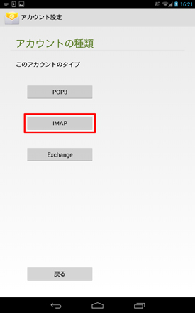 【注意】「接続パスワード」ではありません。 - [アカウントの種類]で[IMAP]をタップする。