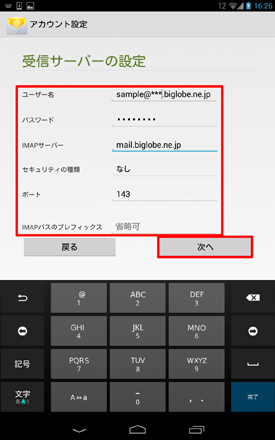 - IMAPサーバーの設定を「mail.biglobe.ne.jp」に変更し、[次へ]をタップする。(そのほかの項目は変更不要)