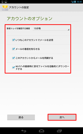 チェックすると、Wi-Fi接続時に、メールに添付されているファイルを自動的にダウンロードします。 - [アカウントの設定が完了しました。]と表示されるので、このアカウント情報に名前をつける場合はアカウント名を入力し(任意)、[次へ]をタップする。