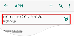 APN(アクセスポイント)一覧上で、「BIGLOBE モバイルタイプD」または「BIGLOBE モバイルタイプA」の右横が